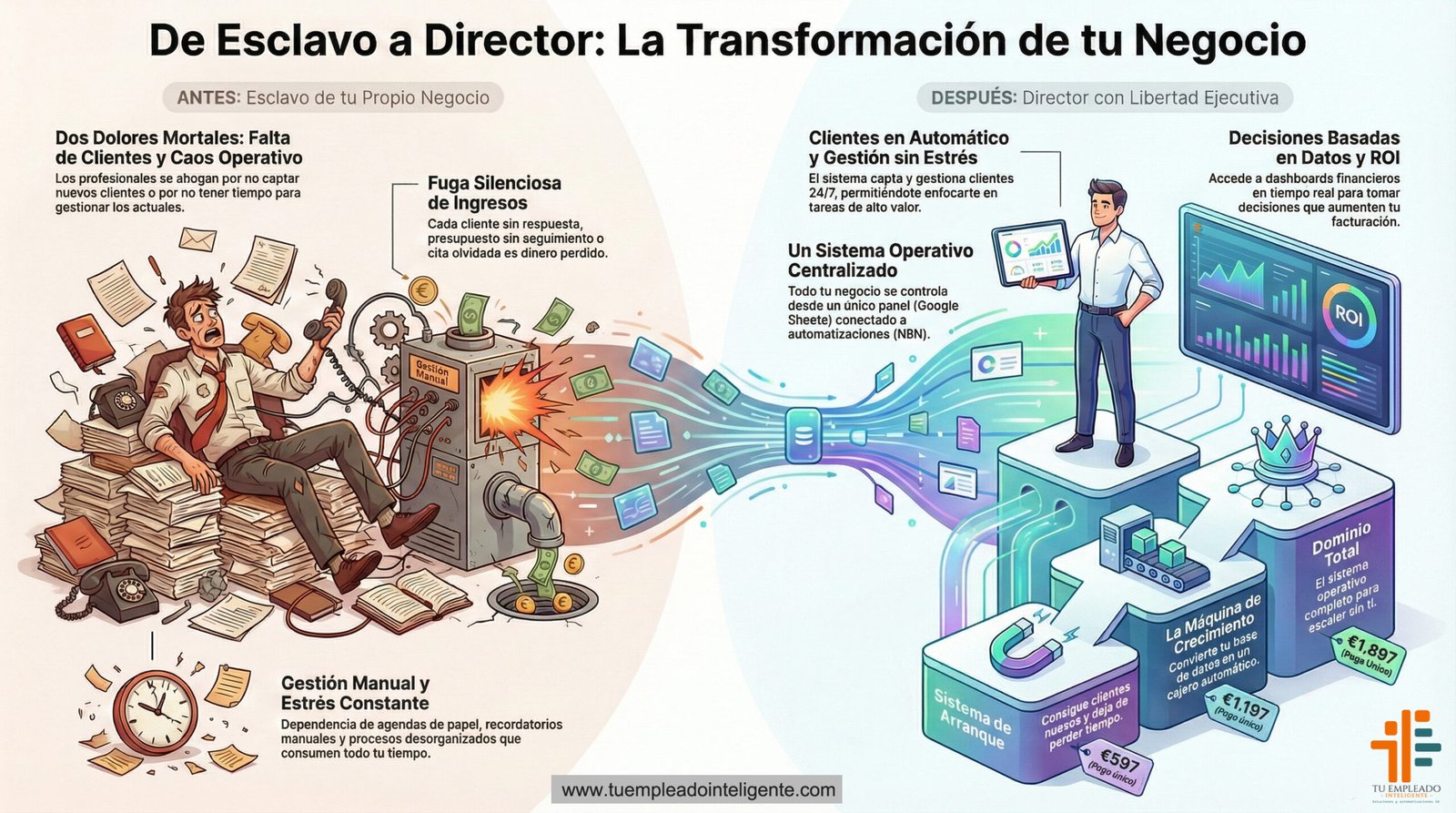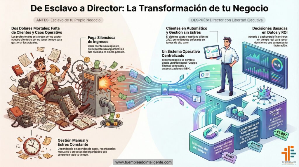 Pasamos de la 'GESTIÓN MANUAL Y ESTRÉS' al 'SISTEMA OPERATIVO CENTRALIZADO'. Tú controlas el tablero, la IA mueve las fichas.
